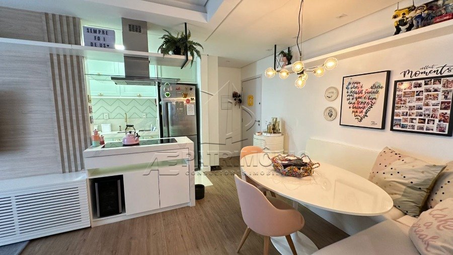 O apartamento conta com 2 dormitórios, sendo 1 suíte, ambos com móveis planejados de ótima qualidade. Os banheiros são espaçosos, bem acabados e funcionais, reforçando o padrão moderno do imóvel. A cozinha planejada possui excelente aproveitamento de espaço e integração total com o living.