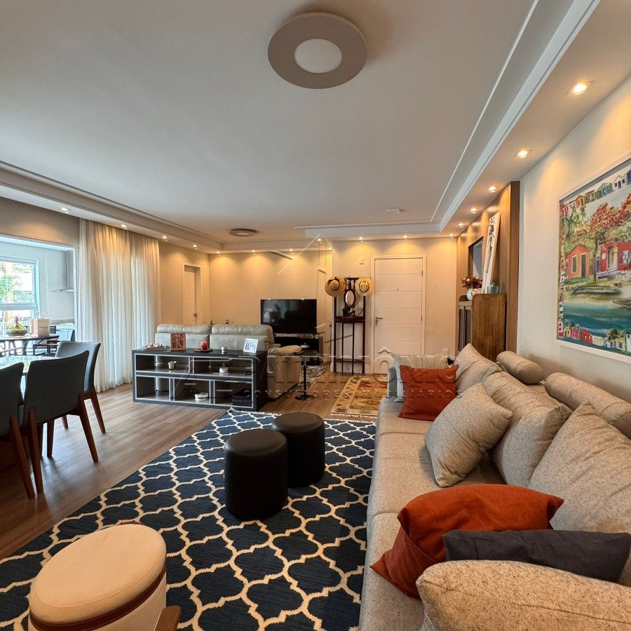 O apartamento é muito integrado, conectando sala em três ambientes e espaço gourmet em um único fluxo leve e contemporâneo, ideal para quem gosta de amplitude, funcionalidade e de receber bem!