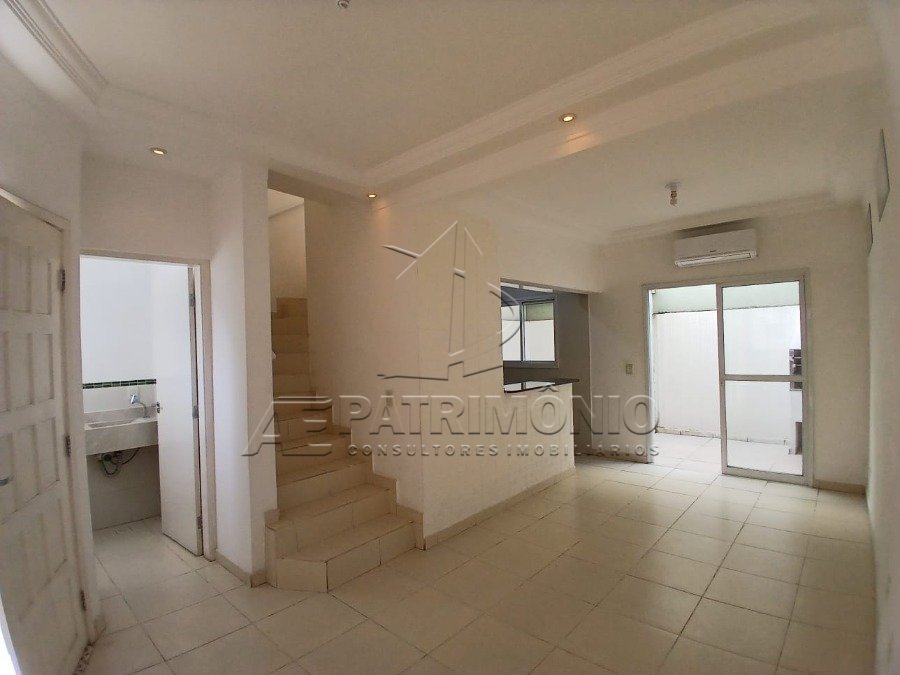 Sobrado em condomínio com sala 2 ambientes, cozinha planejada, lavabo, banheiro social, 2 suítes, área de serviço, quintal e 2 garagens cobertas.