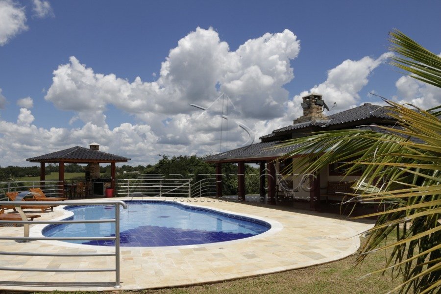 Acabamento Externo: Piscina de alvenaria em estrutura muito reforçada, com hidromassagem, cascata e um quiosque com vista de toda propriedade. Um lago com muito peixe e quiosques com balança pelo redor, onde existe um sistema de drenagem das águas pluviais que passam pelo lago e o excedente desce para a horta e pomar, pomar este com diversas frutas inclusive exóticas, hortaliças, legumes, e uma área de preservação linda, com riacho passando por ela. Canil com o mesmo acabamento da casa. Alarme, câmera de segurança, portão automático e TV a cabo.