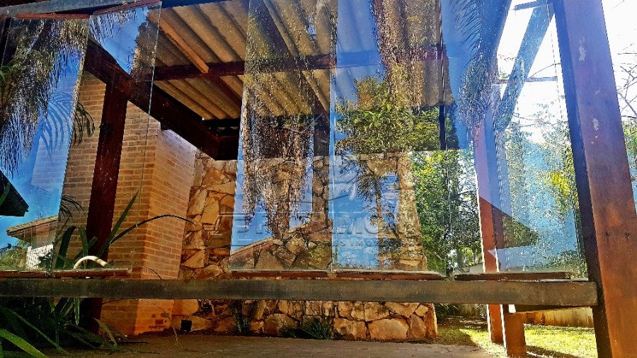 Um projeto arquitetônico diferenciado, remetendo ao requinte e aconchego de uma casa de campo. Possui 4 Suítes, todas com armários planejados, aquecedor solar, Domus e Ar condicionado em todos os dormitórios, sendo 1 Suíte Master com Hidromassagem, jardim de inverno, Closet. Corredor de passagem entre os dormitórios com um espaçoso roupeiro auxiliar, escritório com parede em vidro, proporcionando vista para um belo jardim, aliás as salas também integram a vista para a belíssima área verde do imóvel, todas com piso em madeira Ipê . Um gazebo na lateral do imóvel com vidro ao redor, próximo a entrada do imóvel e vista para piscina e jardim . Hall de distribuição, Cozinha planejada