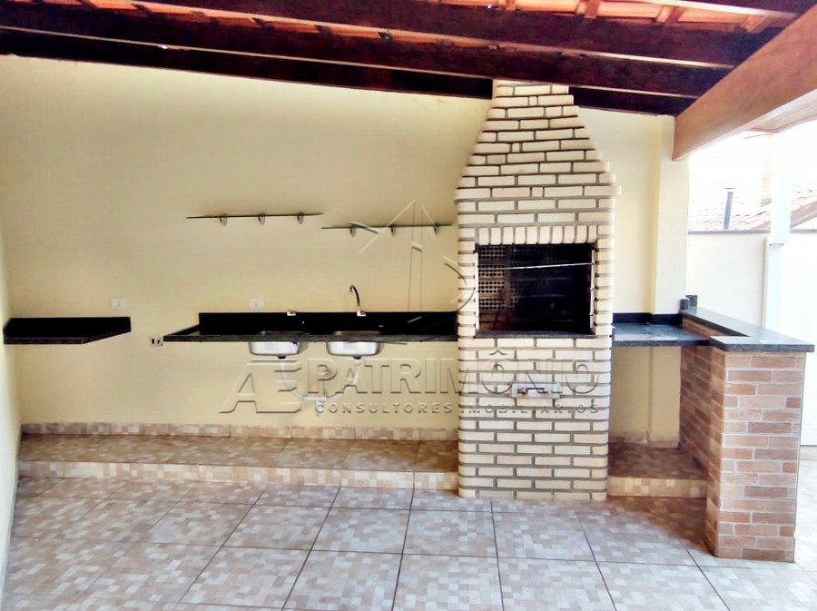 Área gourmet com churrasqueira, bancada e pia.