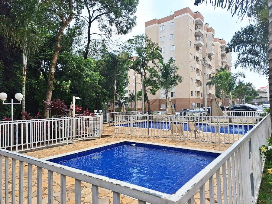 O condomínio oferece lazer completo com duas piscinas, salão de festas, churrasqueira, academia e segurança 24 horas. O apartamento inclui uma vaga de garagem descoberta.