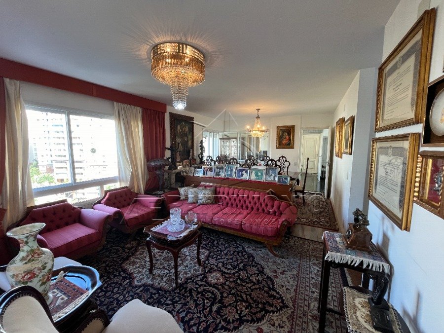O apartamento conta com três suítes, sendo a principal equipada com um espaçoso closet. As áreas sociais, incluindo uma sala íntima de TV, têm assoalho de madeira, conferindo um toque de elegância e aconchego. A lavanderia é funcional, com banheiro e dormitório para funcionários, oferecendo ainda mais conveniência no dia a dia.