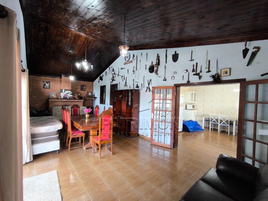 A residência principal possui uma sala aconchegante com lareira, conjugada com a sala de jantar. A cozinha é bem arejada, com uma janela que se abre para a varanda, e há um banheiro social. Além disso, são 2 dormitórios com ar-condicionado, sendo um deles uma suíte. Na parte inferior da residência, encontra-se um salão de festas completo, equipado com churrasqueira e banheiros masculino e feminino.