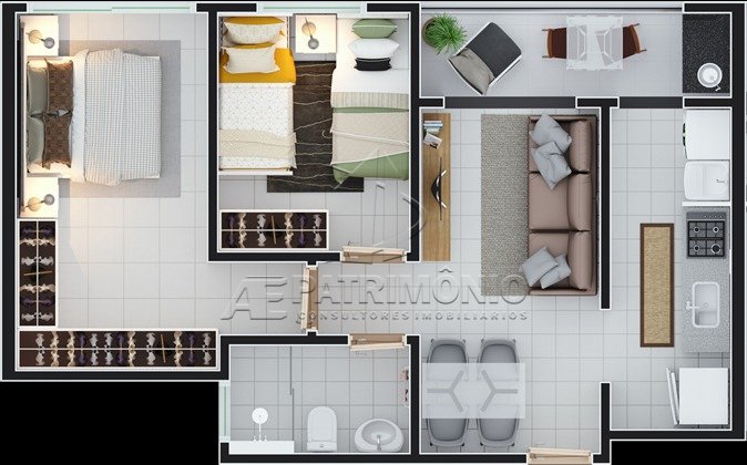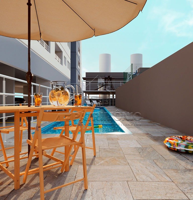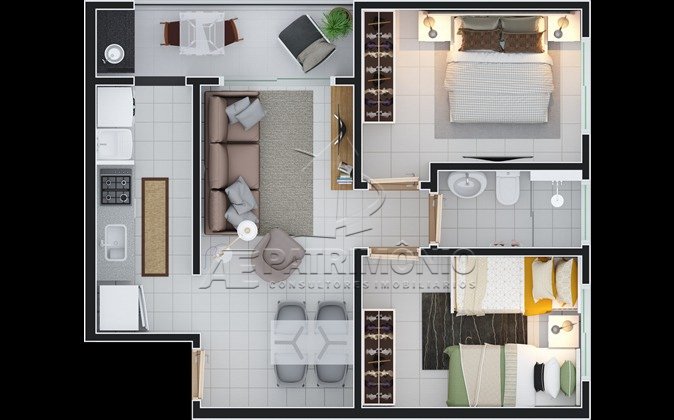 Apartamento com 2 dormitórios, 1 banheiro social, cozinha, sacada ampla, lavanderia, e 1 vaga de garagem.